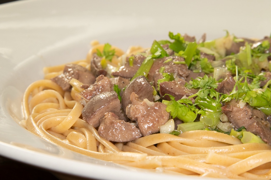 Ein einfaches Innereiengericht auf leckerer Vollkornpasta. Man benötigt nur zwei Schweinenieren, ein wenig Gemüse, gutes Olivenöl und Volllkornlinguine. Die Soße bildet man aus dem Olivenöl und einem Schöpflöffel des Nudelwassers. Zutaten für 2 Personen: Zubereitungszeit: Vorbereitungszeit 10 Min. | Garzeit 12 Min. Zubereitung: Nieren von allem Fett befreien. Dann jeweils längs in zwei Scheiben schneiden,