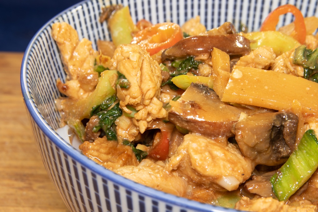 Putenbrustfilet mit Gemüse und Champignons in Chu-Hou-Kokosmilch-Soße auf Reisnudeln