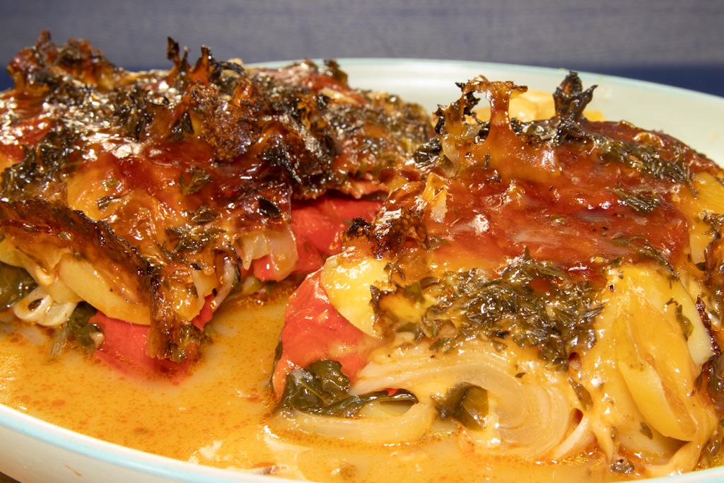 Ein wunderbarer Auflauf. Mit Kartoffeln, Chorizo, rotem Paprika, Spinat, Zwiebel, Knoblauch, und Mozzarella. Gegart in selbst zubereiteter Hühnerbrühe. Und natürlich viel frischem Thymian, dessen Blättchen gezupft einfach in die Brühe kommen. Die Chorizoscheiben geben dem Auflauf eine kräftige Würze. Und auch die frische Hühnerbrühe und der frische Thymian steuern ihre Aromen zum Auflauf hinzu. Im