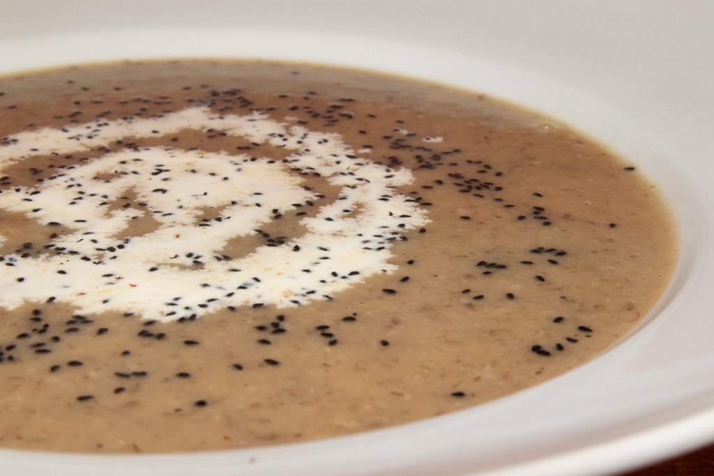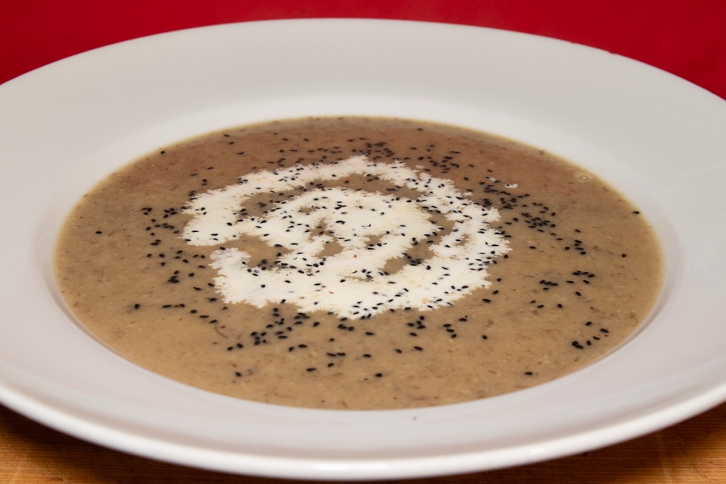 Suppe auf zwei tiefe Suppenteller verteilen. Mit etwas Sahne dekorieren. Und ein wenig von dem Schwarzkümmelsamen darauf verstreuen.