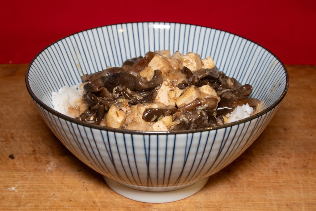 Reis auf zwei tiefe Reisbowls verteilen. Tofu mit Waldpilzen und Soße darüber geben. Servieren. Guten Appetit!