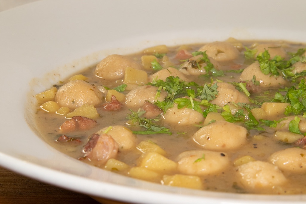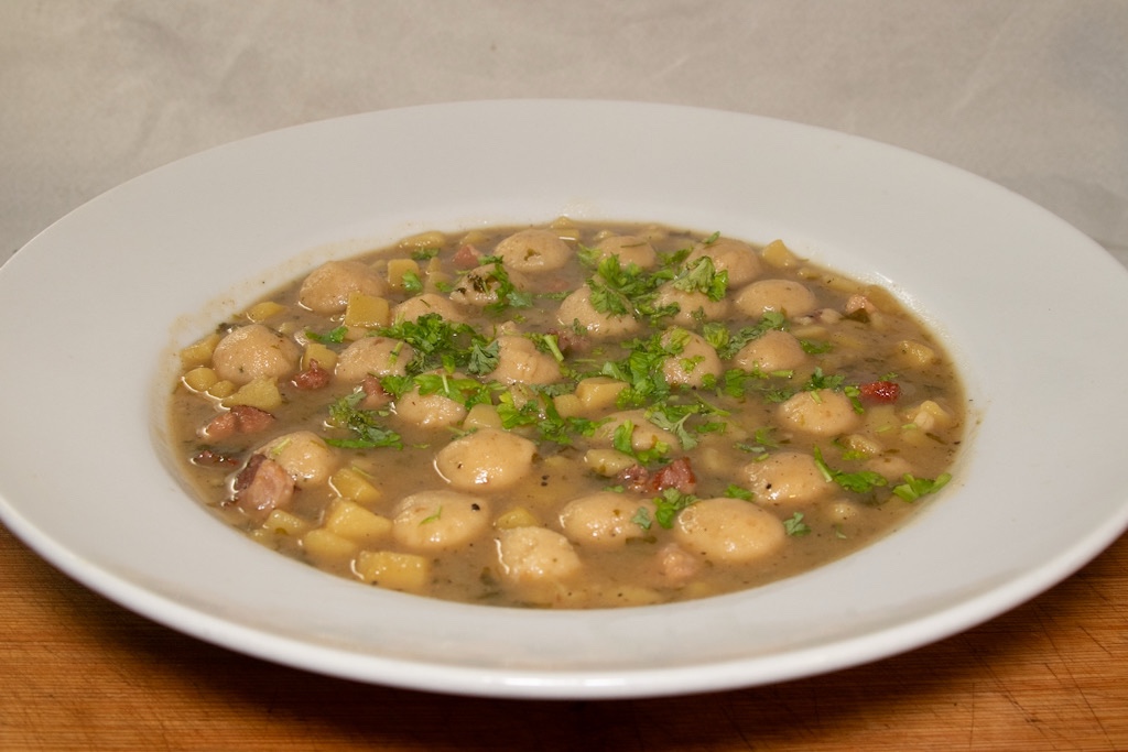 Eintopf mit Markklößchen, Speck, Kartoffeln und Petersilie