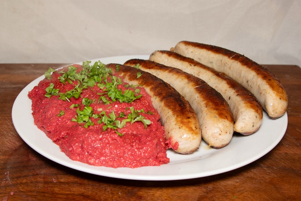 Grobe Bratwürste auf Mais-Rote-Beete-Püree