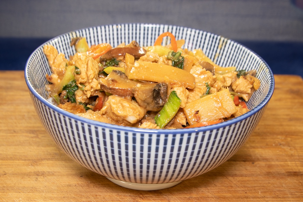 Eine fast klassische asiatische Zubereitung. Geflügelfleisch, Gemüse und Pilze. Dazu Reisnudeln. Und eine feine Soße.