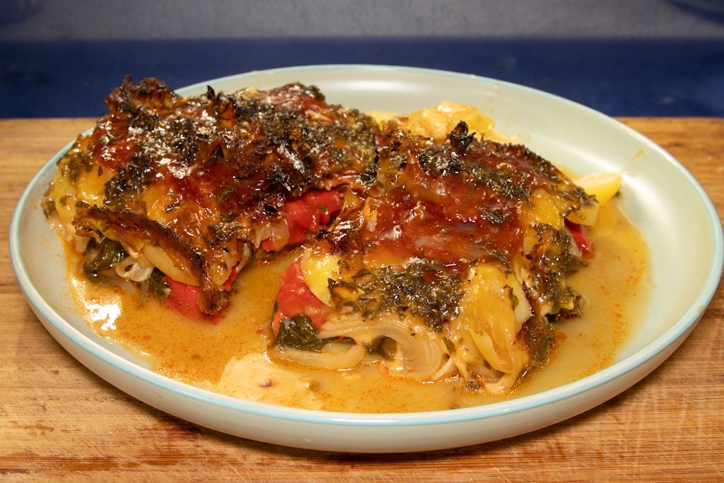 Herausnehmen. Inhalt der Auflaufform mit einem Pfannenwender oder auch Messer einmal quer in der Mitte halbieren und die beiden Hälften mit dem Pfannenwender auf einen großen Teller geben. Servieren. guten Appetit!
